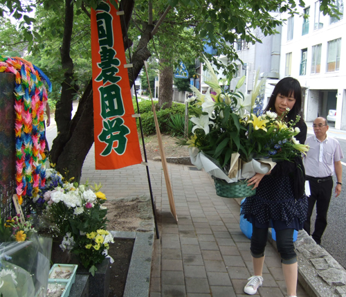 5日は福島県職員組合の國分さんを招き、福島原発事故以降の生々しい実態を講演して頂いた。その後、フィールドワークで原爆ドームなどをめぐり被爆の実態を学習した。翌6日には、平和記念式典を終えた後、広島県農協会原爆物故者慰霊碑前で農団労独自で慰霊祭を行い、2日間の行動を終えた。