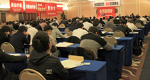 討論集会は課題提起と全体討論を行った後、7つに分かれて分散会討論(写真上:分散会討論の様子)を行った。「2015春闘をどうたたかうのか」という共通テーマを設け、賃金要求や共済事業改革、特例年金一時金払いの選択推進、臨時・パート等の非正規労働者の待遇改善などといった産別課題を中心に各分散会で討論が交わされた。